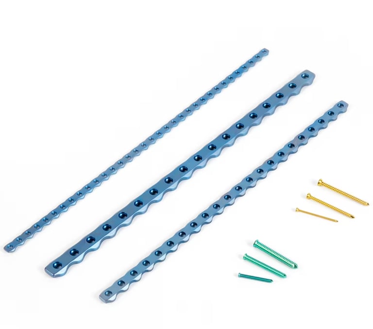 Placas y tornillos: permiten la fijación rígida del foco de fractura, logrando compresión interfragmentaria o neutralización de fuerzas. Son ideales para fracturas diafisarias y metafisarias, ya que brindan excelente estabilidad y control de la alineación ósea.