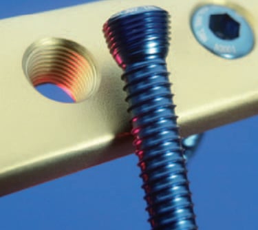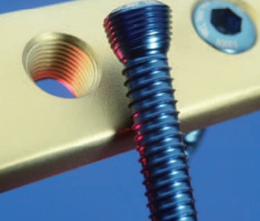 Los tornillos se introducen atravesando la placa y se enroscan en ella, quedando firmemente anclados tanto al hueso como a la placa.